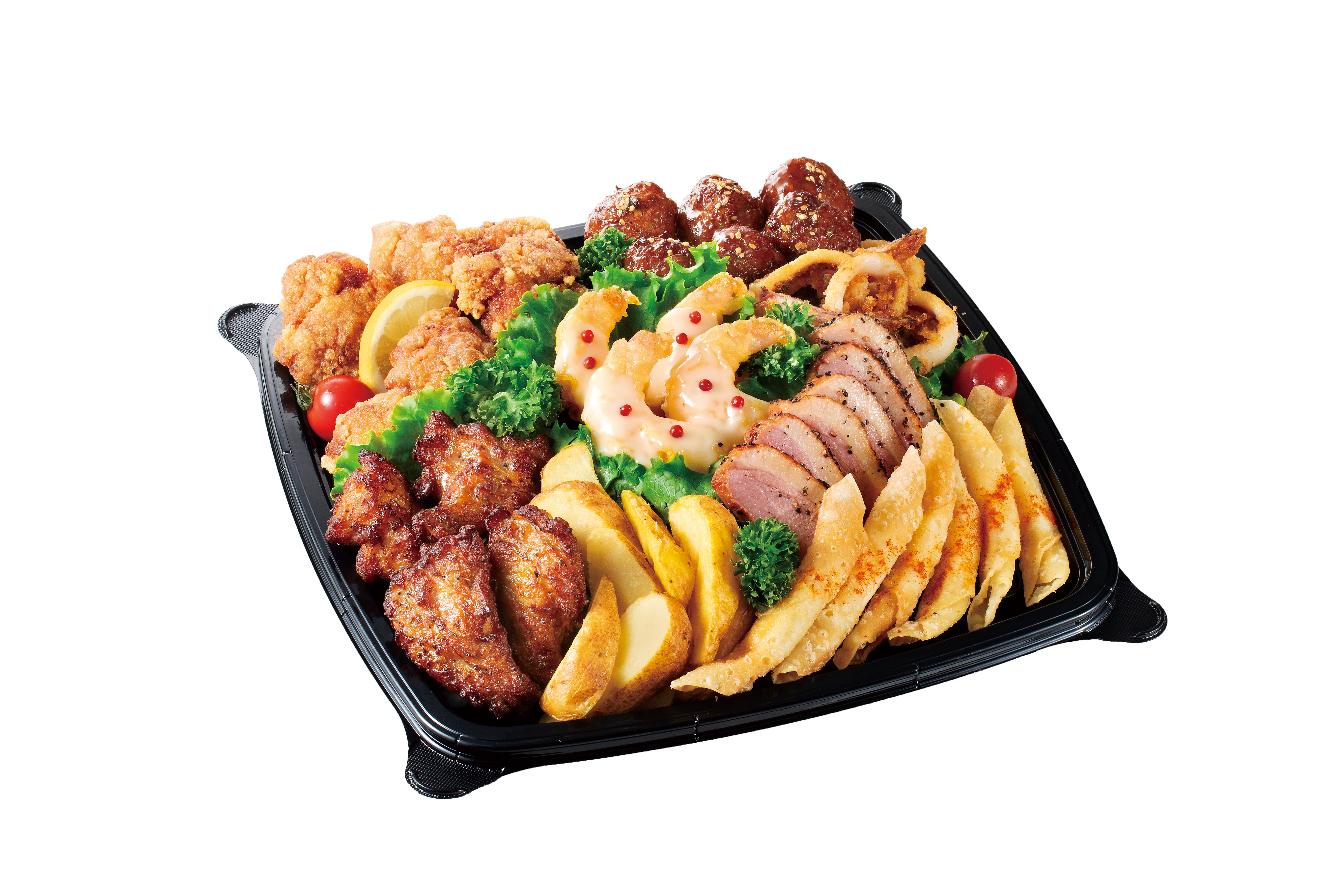 商品内容:肉団子、するめいかのから揚げ、合鴨ロースト、チーズ揚げ、フライドポテト、炙りチキン、醤油から揚げ、エビマヨ、パセリ、レモン、プチトマト