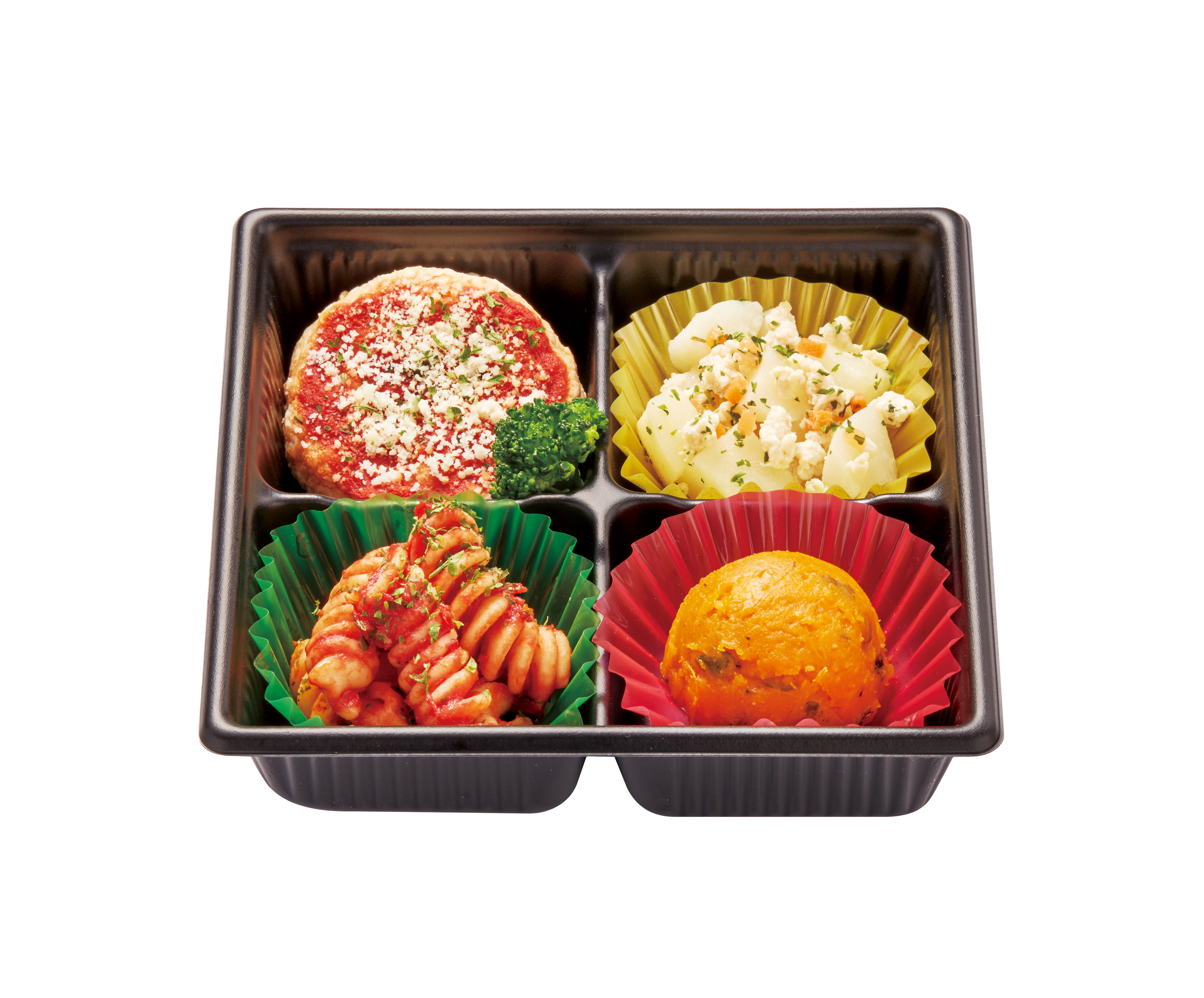 商品内容:ミニチキンピザ、温野菜(ブロッコリー)、チキン&ポテト、トマトソ-スパスタ、スイートパンプキン