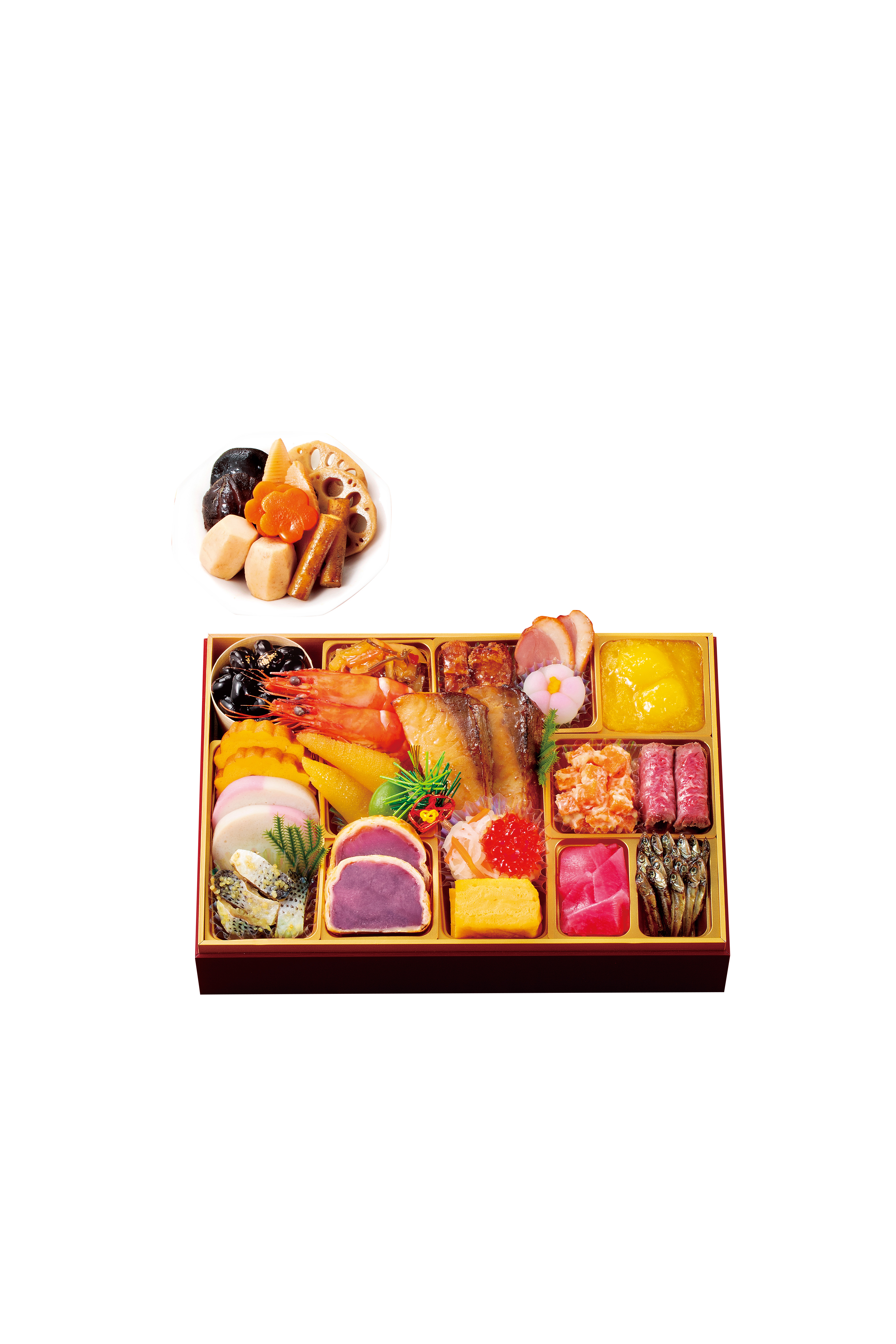 商品内容:(壱の重)丹波篠山黒豆・松前漬・豚角煮・合鴨スモーク・梅花もち・栗きんとん・伊達巻・市松かまぼこ・こはだ粟漬・焼海老・味付数の子・若桃甘露煮・リンゴと紫芋のパイ包み・ぶり照焼・紅白なます・味付いくら・厚焼玉子・明太風味サラダ・ローストビーフ・紅芯大根の酢の物・田作り