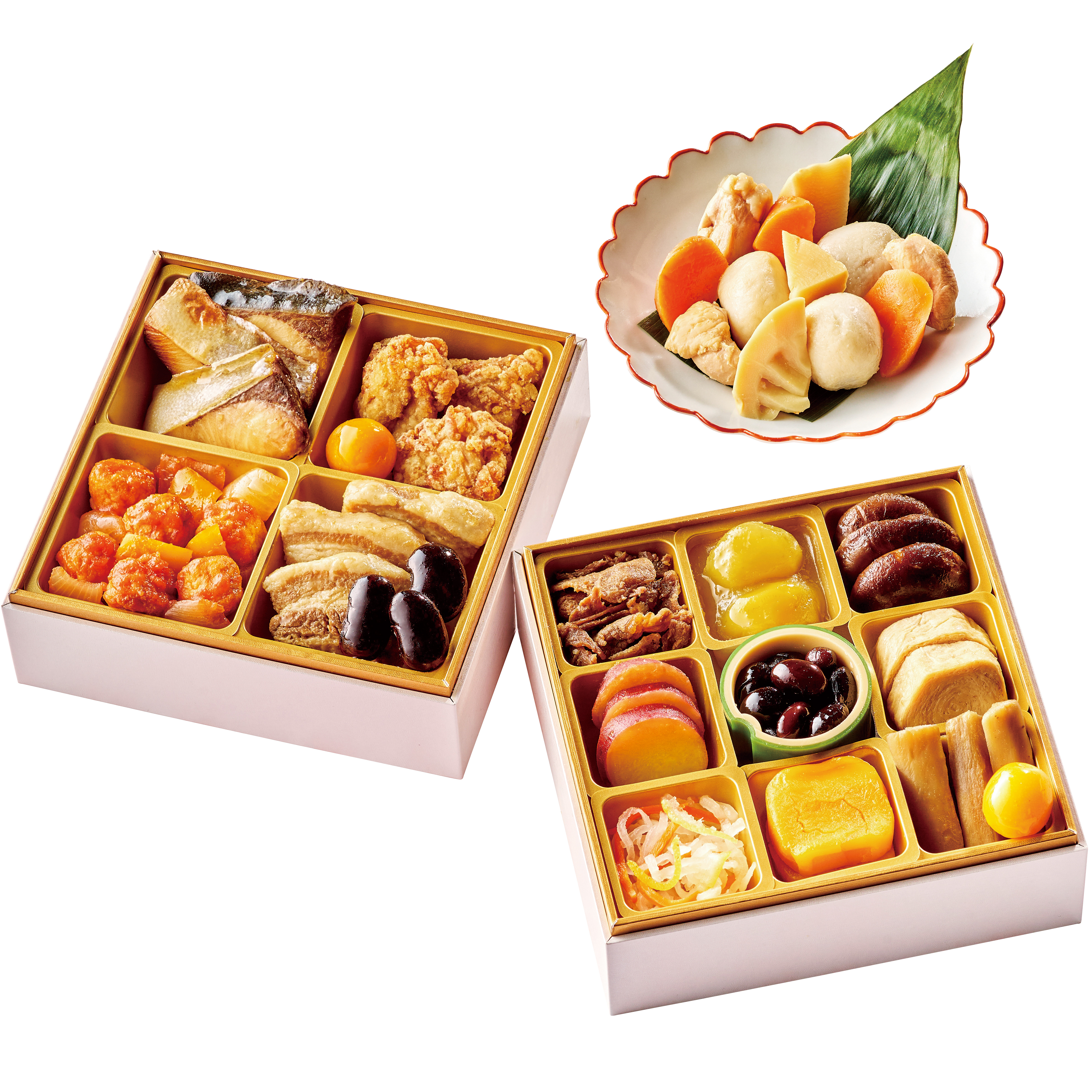 (弐の重)大分県佐伯市産ぶり照焼・佐賀県産若鶏の唐揚げ・国産金柑の甘露煮・平田牧場三元豚の角煮・北海道産紫花豆煮・宮崎県産若鶏のミートボールと野菜の甘酢和え