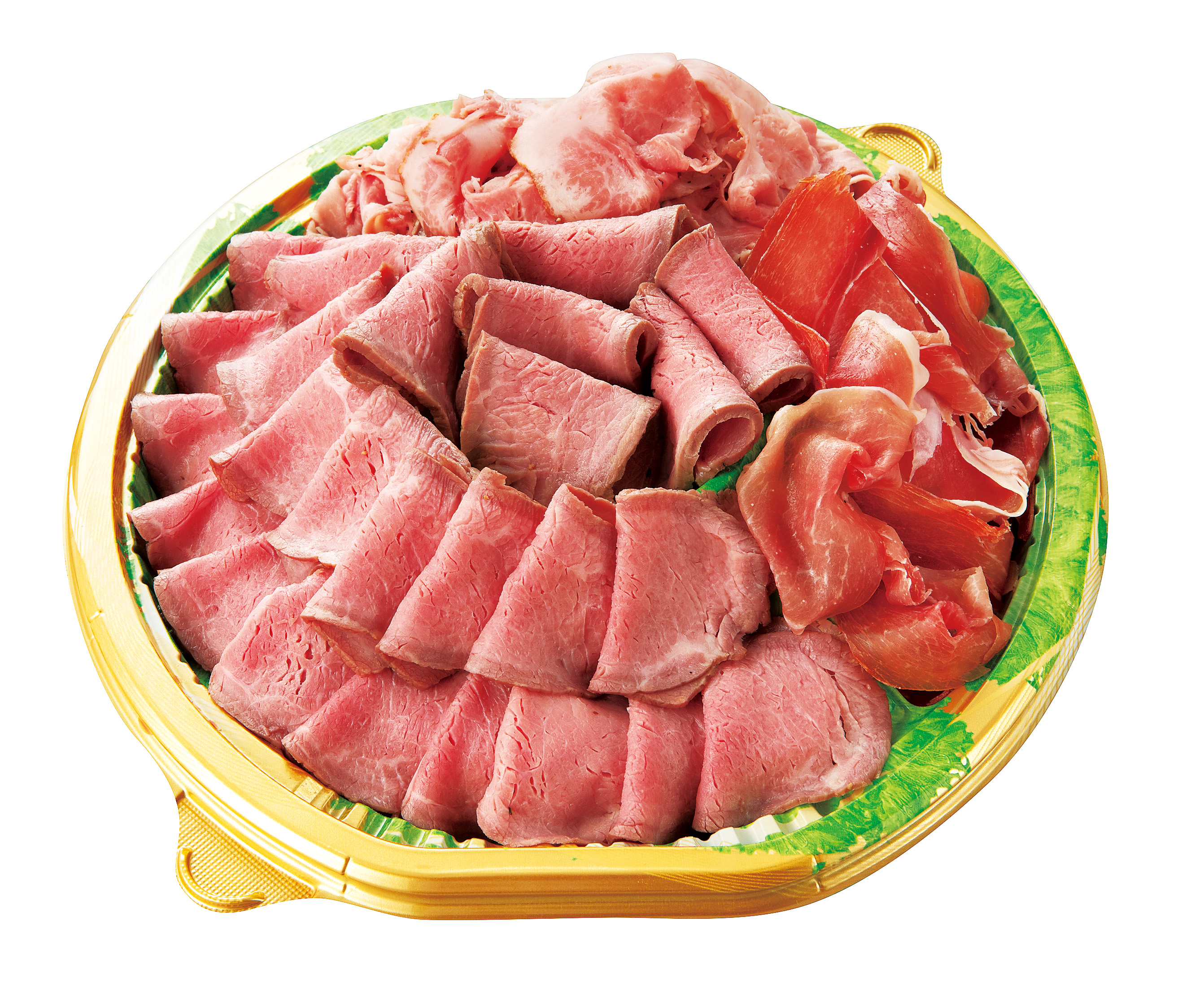 商品内容:とも三角使用のやわらかローストビーフ、ローストポーク、生ハム