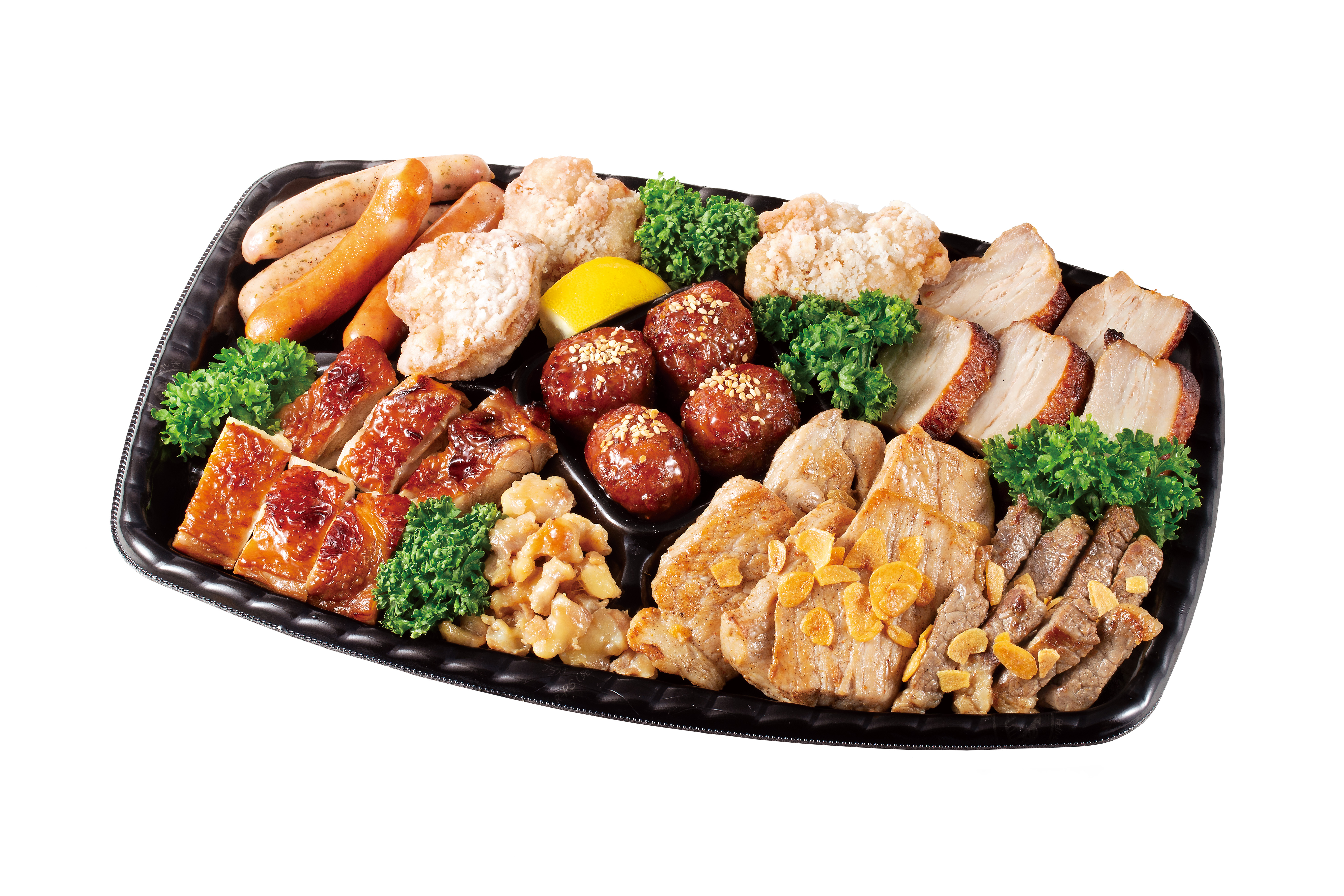商品内容:しっとり焼豚・牛ジューシーカットステーキ(ガーリック)・豚ロースやわらかガーリックステーキ・鶏膝なんこつ旨塩焼・鶏もも照り焼き・ウインナー焼・鶏もも竜田揚・肉団子・パセリ・レモン