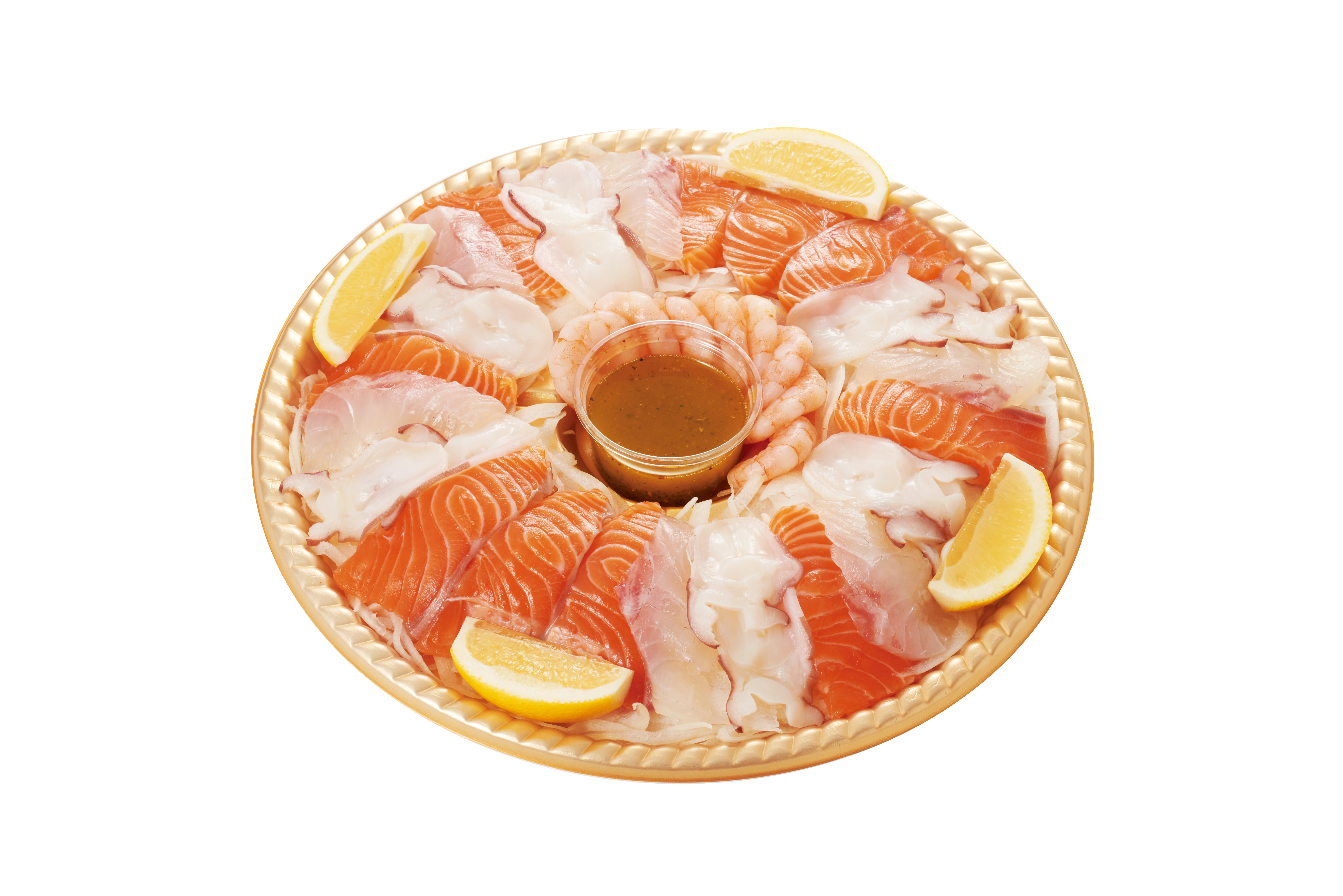 商品内容:生アトランティックサーモン、水たこ、まだい、えび、たまねぎ、レモン、バジルソース