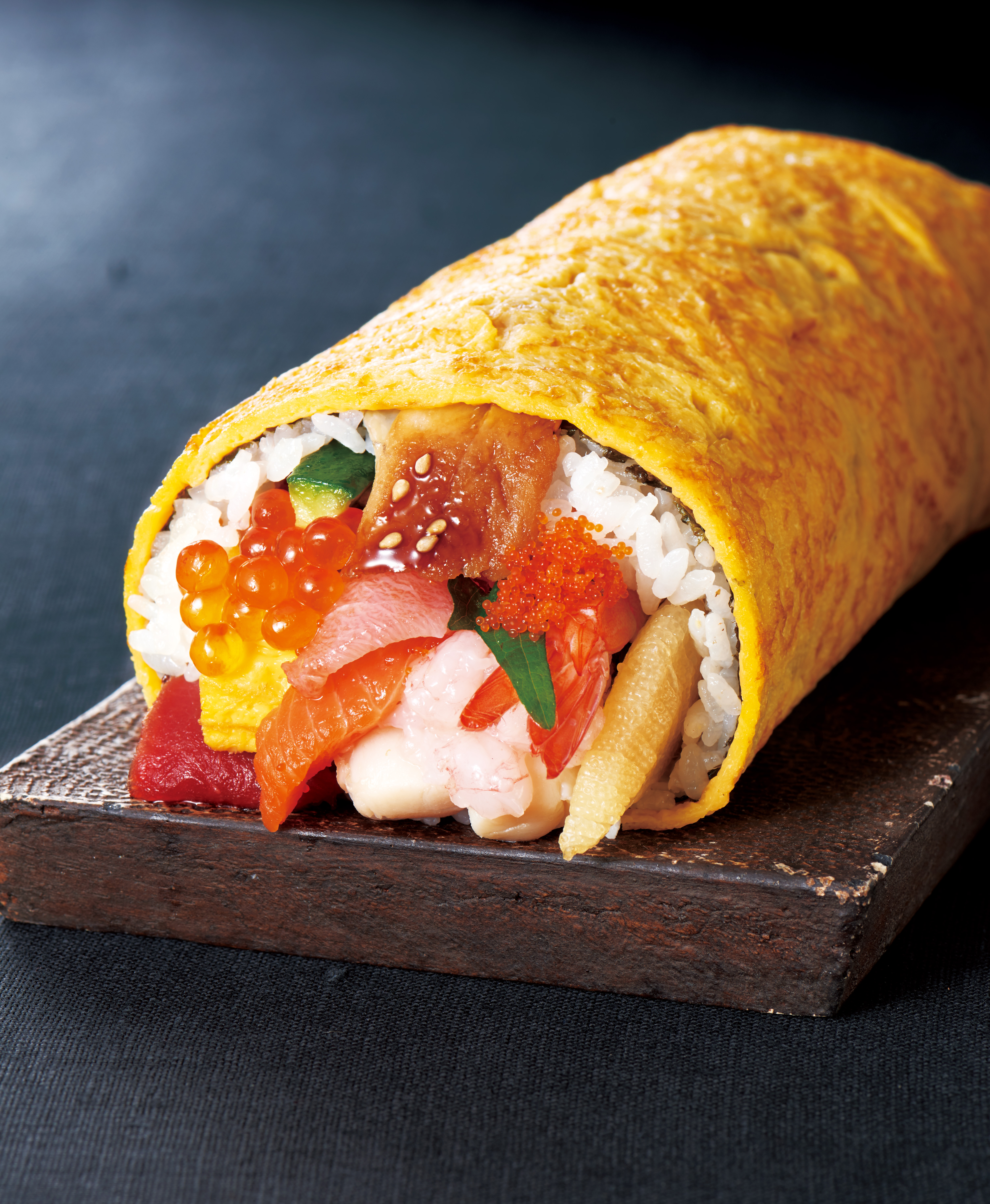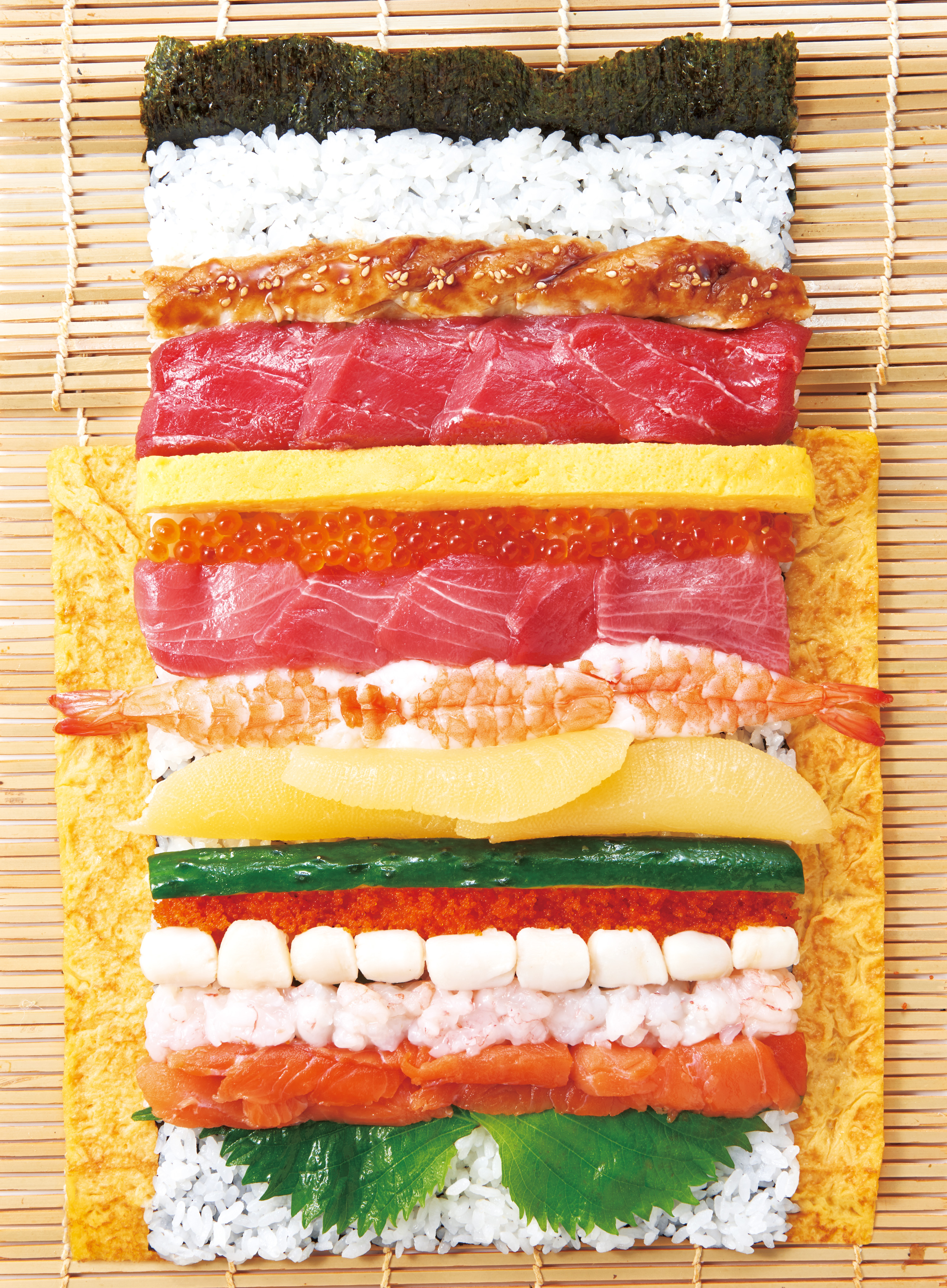 本まぐろ中トロ、本まぐろ赤身、北海道産いくら、小柱、サーモン、数の子、海老、穴子、白ゴマ、玉子錦糸、数の子バラ子、大葉、厚焼玉子、きゅうり