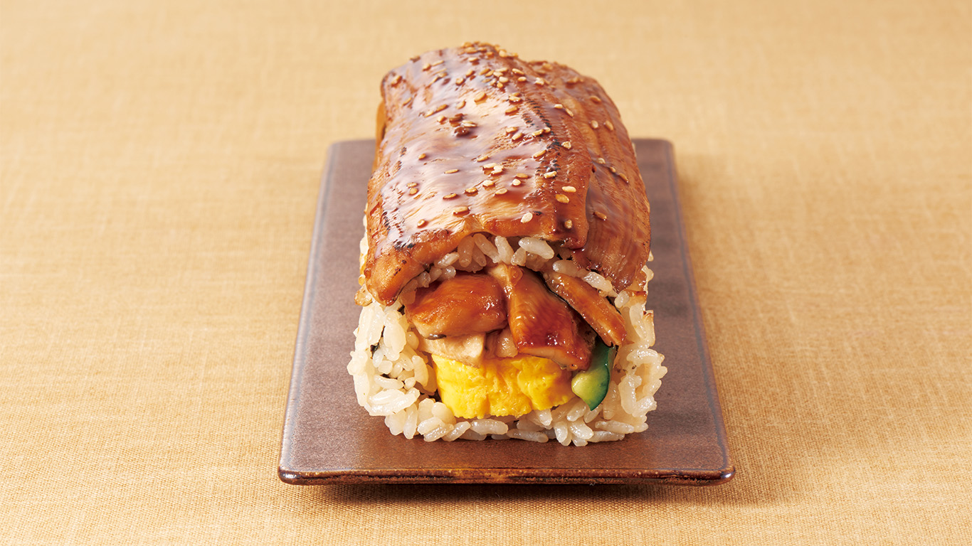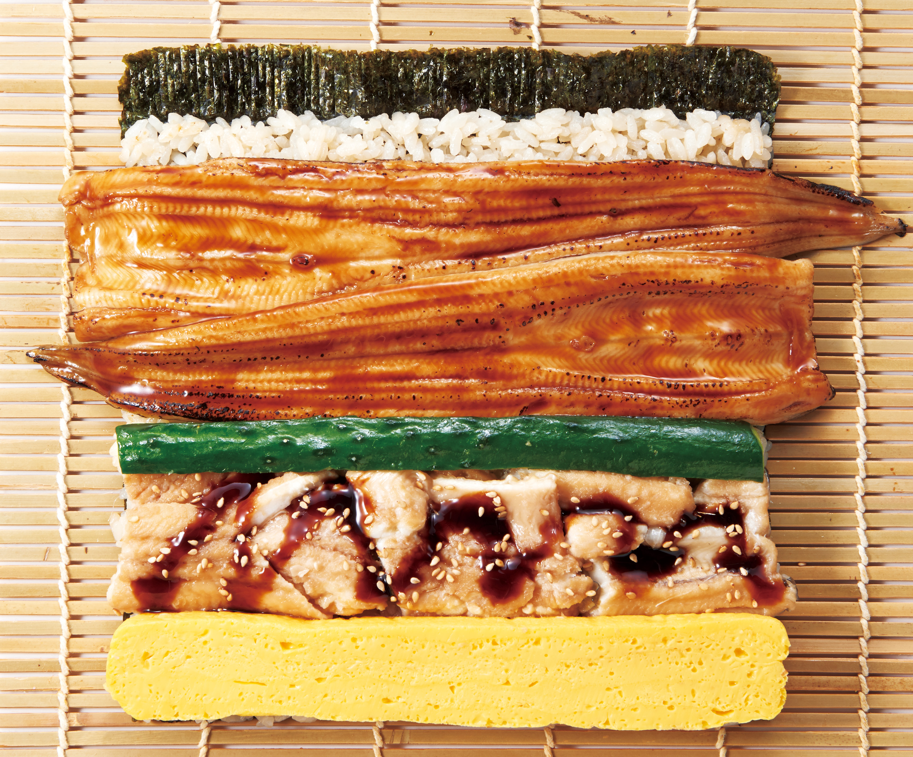 活〆炙り煮穴子、活〆煮穴子、厚焼玉子、きゅうり、白ゴマ