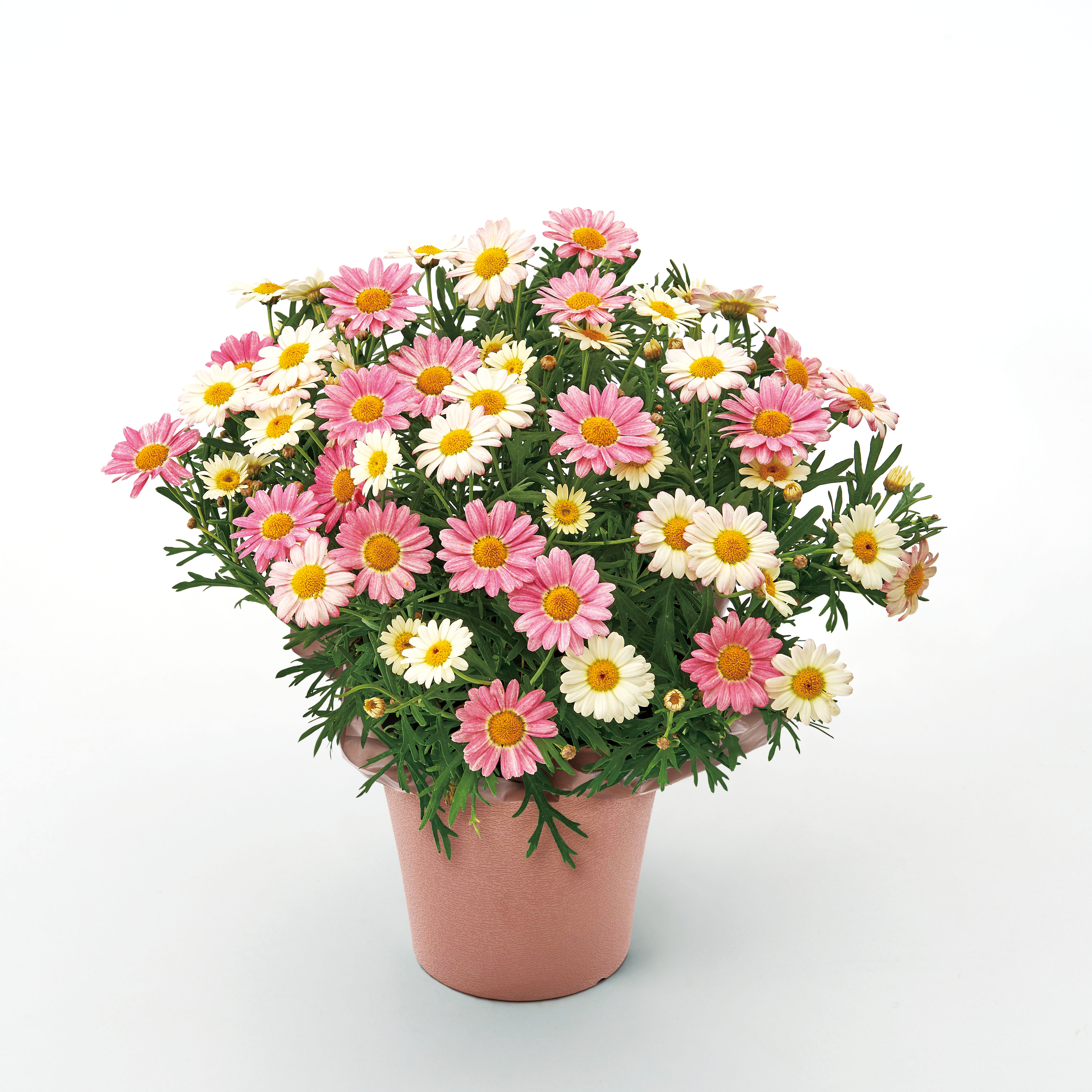 マーガレット「いちごみるく」(5 号)、 鉢カバー(樹脂製)、ラッピング
