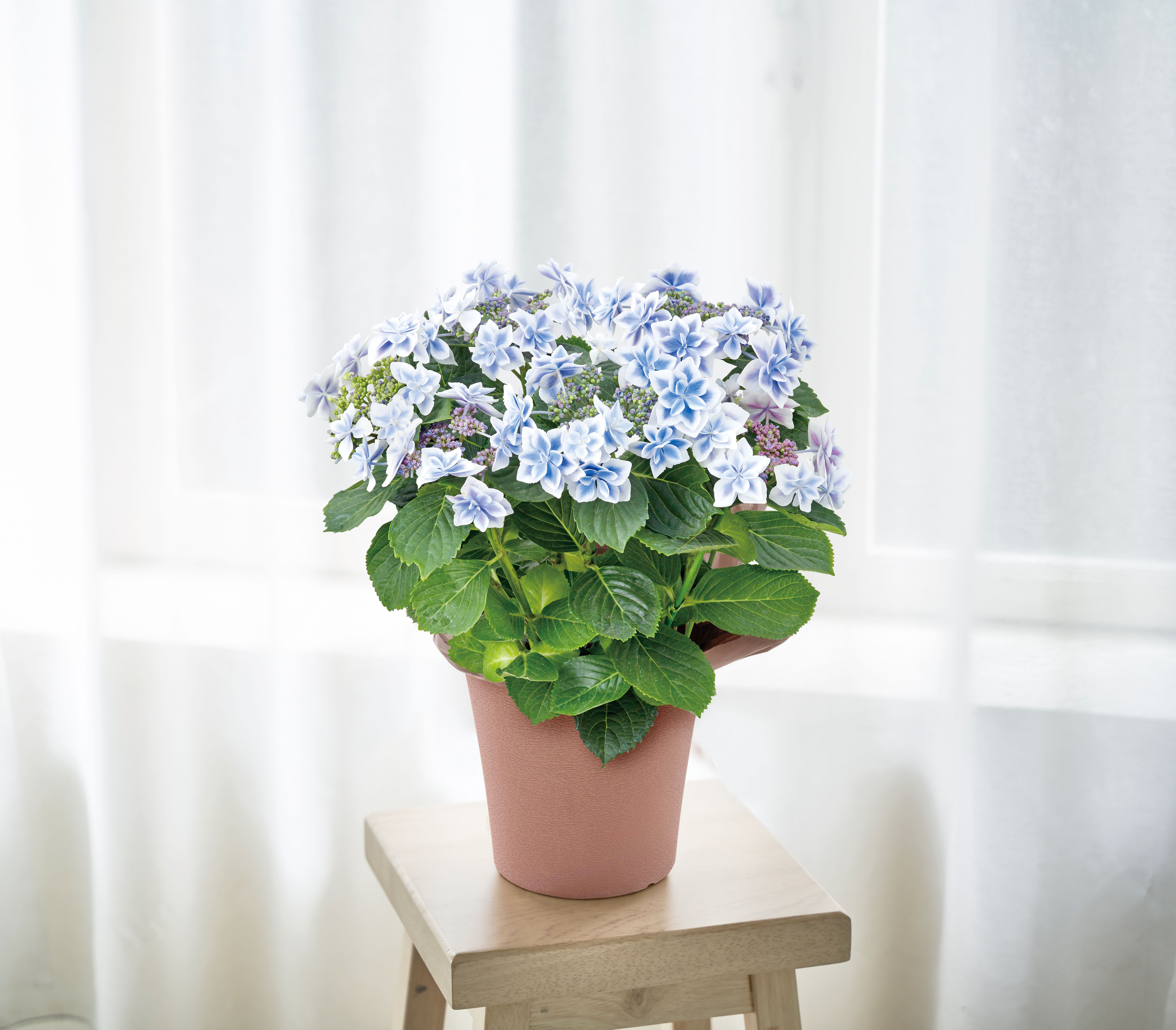 あじさい(コンペイトウブルー)(5 号)、鉢カバー(樹脂製)、ラッピング